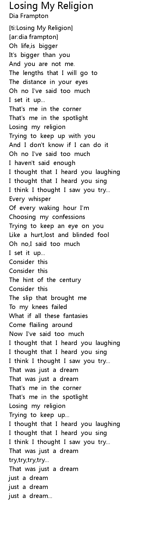 R.E.M. was one of the hottest alternative acts of the 80s and 90s. One of their hits, "Losing My Religion" wasn't about religion at all.. Losing My Religion Lyrics Meaning are a theme that is being searched for and favored by netizens nowadays. You can Get the Losing My Religion Lyrics Meaning here. Save all royalty-free images. Understanding Losing My Religion, I'm back from vacation, and it's time to talk about REM. Losing My Religion is the song that brought REM into the mainstream, but .